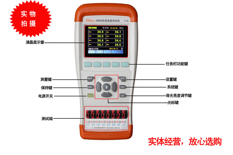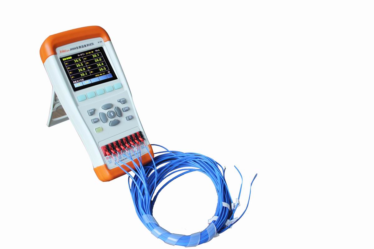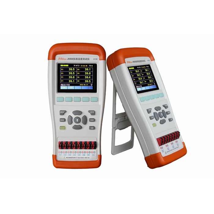 JK808 手持式多路温度测试仪是ARM微处理器控制的手持多路温度测试仪,采样多路并行测试,同时对8路温度进行采集、报警、和通讯传输。兼容多种温度传感器,响应快,数据稳定,同时具有断偶检测功能。采样最先进的测试原理,使温度测试分辨率到0.1度。JK808手持多路温度测试仪具有广泛的适应性,支持K/N/E/J/T/R/S/B型热电偶。测试范围从-200℃~1800℃。操作更简单,方便,仪器能很好的兼容大容量存储器并具有强大的PC机通讯能力,仪器标配USB接口,并且提供免费的通讯通过PC软件可轻松实现数据采集、分析和打印。 JK808采用坚固抗振的外壳,可在苛刻的环境下工作。全隔离的数字和模拟信号,安全可靠。JK808标配U盘接口,支持实时数据存储。